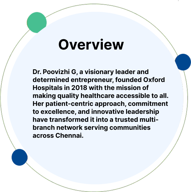 A visionary leader, Dr. Poovizhi G founded Oxford Hospitals as a sole proprietorship in 2018 with the mission of making quality hospitals accessible to all. As a determined single woman entrepreneur, she transformed a modest beginning into a growing multi-branch hospitals network that serves communities across Chennai. Guided by her strong values of compassion, integrity, and excellence, she has built Oxford Hospitals into a trusted name known for its patient-centric approach, advanced treatments, and commitment to affordability. Her leadership, resilience, and innovative mindset continue to drive the organization’s success, inspiring her team to uphold the highest standards of care while expanding the reach of hospitals services to benefit countless families.
